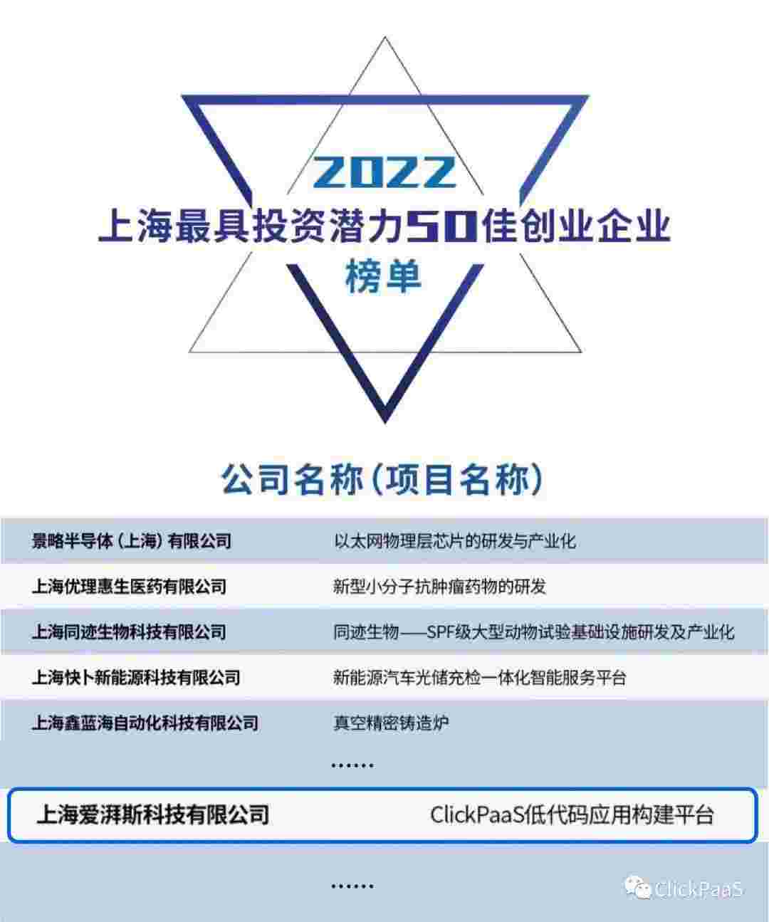 沃钱包 作为国内低代码PaaS平台的领军企业,,,,与120家创企入围角逐。。期间接受了来自德同资本、、、领中资本等知名投资机构的10位投资人组成专家评委团的背靠背盲选。。。。并最终入围“2022上海最具投资潜力50佳创业企业”榜单,,,被列入“上海市重点培育创业企业库”。。。