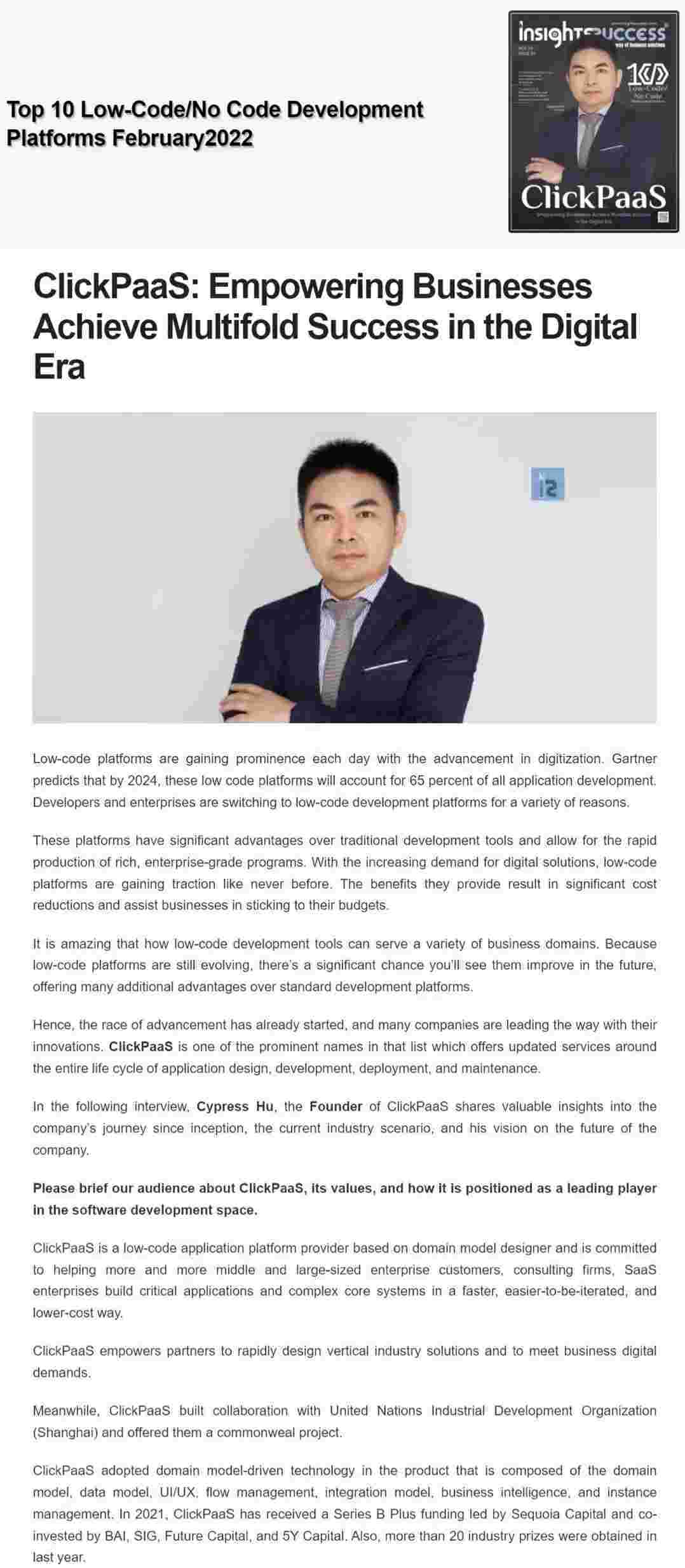 2022年年初,,,,沃钱包入选外媒Insights Success低代码/无代码开发平台 Top10,,,创始人、、、CEO胡柏受邀接受专访并荣登封面人物,,他与Insights Success的读者分享了沃钱包成立的初心、、、、发展历程、、、、当前的行业发展趋势以及他对公司未来的展望。。。。